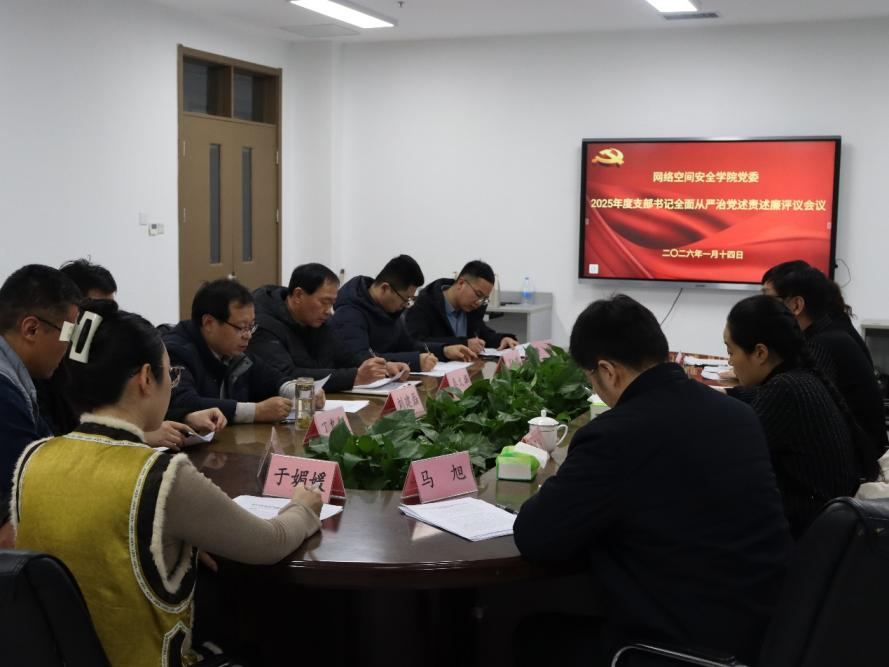 2025年度党支部书记履行全面从严治党述责述廉评议会议于格物楼A504会议室召开。学院党委书记田云飞、党委副书记范瑞红、副院长马旭和学院各党支部书记参加会议。