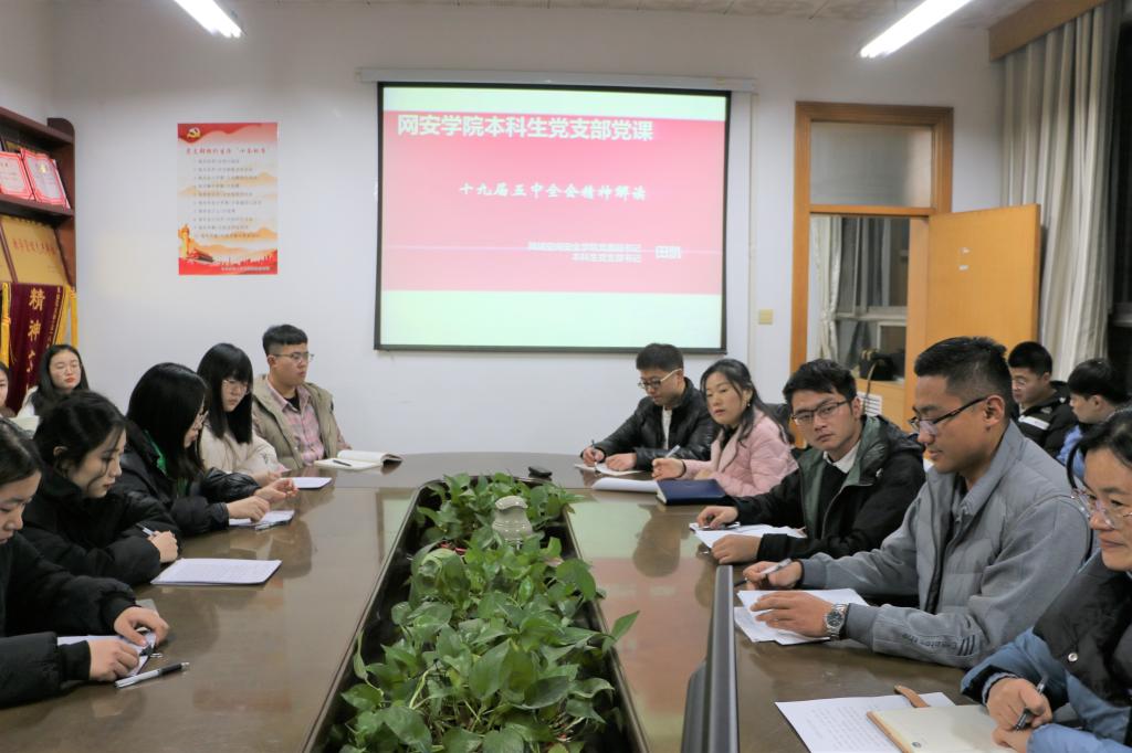 本科生党支部书记田凯在会议室404为本科生党员讲党课,主题为“十九届五中全会精神解读”。团委书记范瑞红、辅导员洪亚玲、武玉龙、丁允念及全体学生党员参加本次党课。
