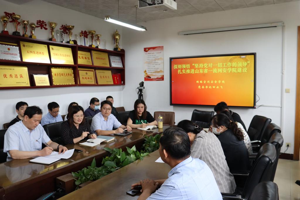 院讯(通讯员:徐娟 摄影:丁允念 洪亚玲)根据学院党委学习贯彻习近平新时代中国特色社会主义思想主题教育工作安排,5月31日下午,教工党支部在学院410会议室举行了书记讲党课活动,学院党委书记田云飞同志以“深刻领悟‘坚持党对一切工作的领导’扎实推进山东省一流网安学院建设”为题讲授主题教育专题党课。全体教工党员参加。