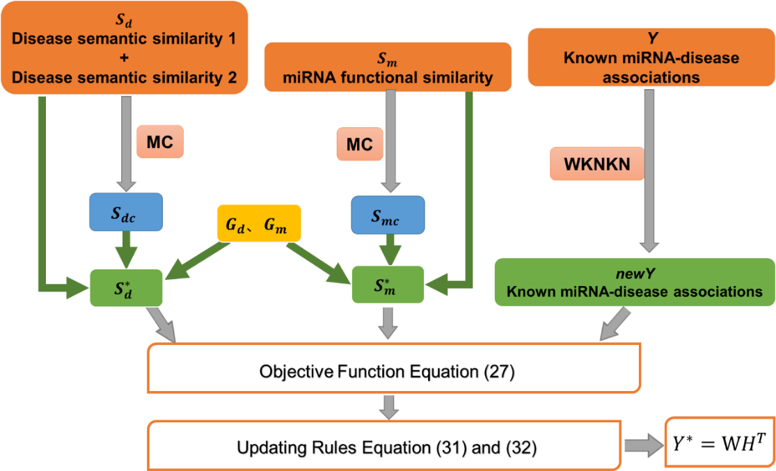 为了可以降低miRNA和疾病相似性网络的稀疏性,MCNMF采用改进后的矩阵填充算法进行预处理,对miRNA和疾病相似性矩阵的低秩矩阵添加核范数以恢复缺失值,对噪声矩阵添加L1,2范数以尽量去除噪音,继而采用ALM算法进行优化求解,从而得到低秩恢复的miRNA和疾病相似性矩阵,从而降低了相似性矩阵的稀疏性。继而,采用双L1,2正则化非负矩阵分解模型完成疾病相关miRNA的识别。五折交叉验证、留一验证以及案例研究的实验结果表明,该方法可以有效提升准确率。