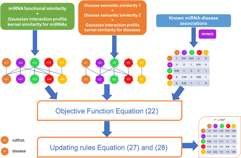 针对当前miRNA和疾病相似性信息不完整,已知miRNA-疾病关联非常稀疏以及NMF算法不够完善的问题,GRL2,1-NMF首先度量miRNA和疾病的相似性,引入了高斯核相似性以丰富相似性信息,从而构建miRNA-疾病异构网络;由于miRNA-疾病关联矩阵极为稀疏,因此对miRNA-疾病关联矩阵进行加权K近邻处理;另外,在非负矩阵分解算法中引入吉洪诺夫正则化、拉普拉斯正则化和L2,1正则化,从而降低了过拟合,增强了数据平滑性,提高了预测潜在的miRNA-疾病对性能。最后采用五折交叉验证、留一验证以及案例研究对其进行性能评估。