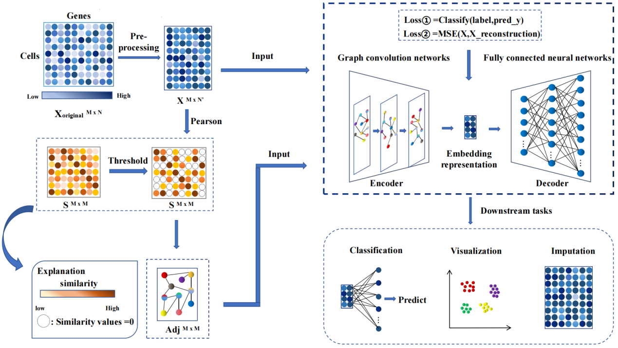 该论文提出了一种基于图卷积神经网络的单细胞分析算法dhaSCA, 旨在学习对scRNA-seq数据中执行下游任务有用的细胞有效表示。它以细胞为节点进行建图,使用混合GCN-MLP深度自编码器捕捉细胞间的结构信息,并学习低维细胞表示。dhaSCA将单细胞数据的嵌入表示、缺失值插补和分类任务集成到统一的端到端深度学习模型中,以下游任务为约束,采用多损失监督策略对细胞结构信息和特征表示的学习过程进行监督。学到的嵌入表示既包含原始特征信息,又包含细胞间相互作用关系,还受到插补任务调节,这有助于从数据中挖掘出更丰富的信息。此外,dhaSCA对数据的分布没有任何假设,因此可以清除最大范围的噪声。在8个真实的scRNA-seq数据集上的多任务实验结果表明,dhaSCA算法在分析单细胞数据方面具有显著的优势,能够显著提升下游任务分析能力。