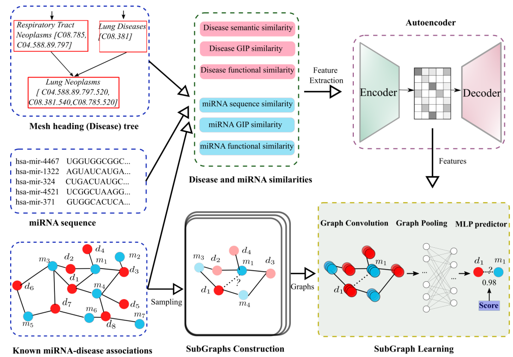 论文提出了一种基于子图学习的miRNA-疾病关联预测方法SGLMDA,旨在准确推断潜在与疾病相关的miRNA。首先根据已知的miRNA-疾病关联,整合了语义、功能、序列等六种miRNA/疾病相似性进行特征提取。其次,构建miRNA-疾病异质图,并为每个miRNA-疾病样本对创建k阶子图。最后,提出了一种子图学习的模型,用于预测miRNA与特定疾病相关联。SGLMDA致力于整合局部域信息和全局结构信息,进而提取更为精确的miRNA-疾病表示,以便更好地理解和揭示它们之间的潜在关联关系。包括5折交叉验证、案例研究和消融实验在内的广泛实验结果表明该方法在预测性能上的有效性和鲁棒性。