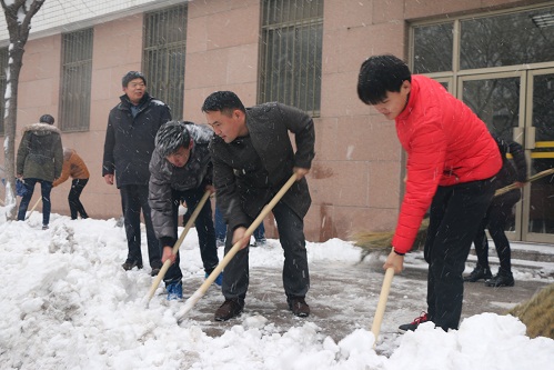 虽然天空中飘着雪花,天气寒冷,积雪较厚,师生们的劳动热情却不减分毫。铁锹翻飞,扫帚舞动,大家齐心协力清除着校园里的积雪,虽然大家的手和脸被冻红,头发和衣服被浸湿、结冰,但大家依然干劲十足,充满热情,享受着团结劳动的快乐。期间,校党委书记荆兆勋、校长戚万学等领导前来慰问老师与同学,对大家的工作表示肯定。面对鼓舞,大家热情高涨,经过一下午的奋战,校园内主干道及人行道上的积雪得以清除。