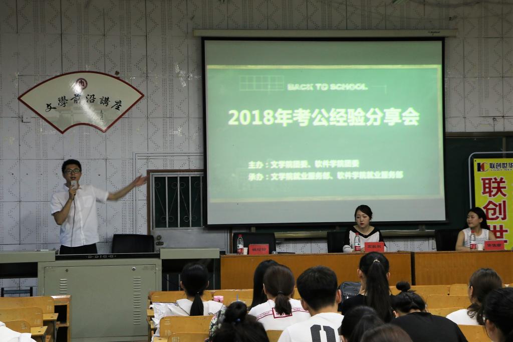 6与8日晚,软件学院与文学院两院就业服务部共同主办的2018考公经验分享会于文史楼509成功召开。侯佳甜、石聪聪、姚盼盼三位同学作为主讲出席此次分享会,两院有考公意向的同学积极参会。