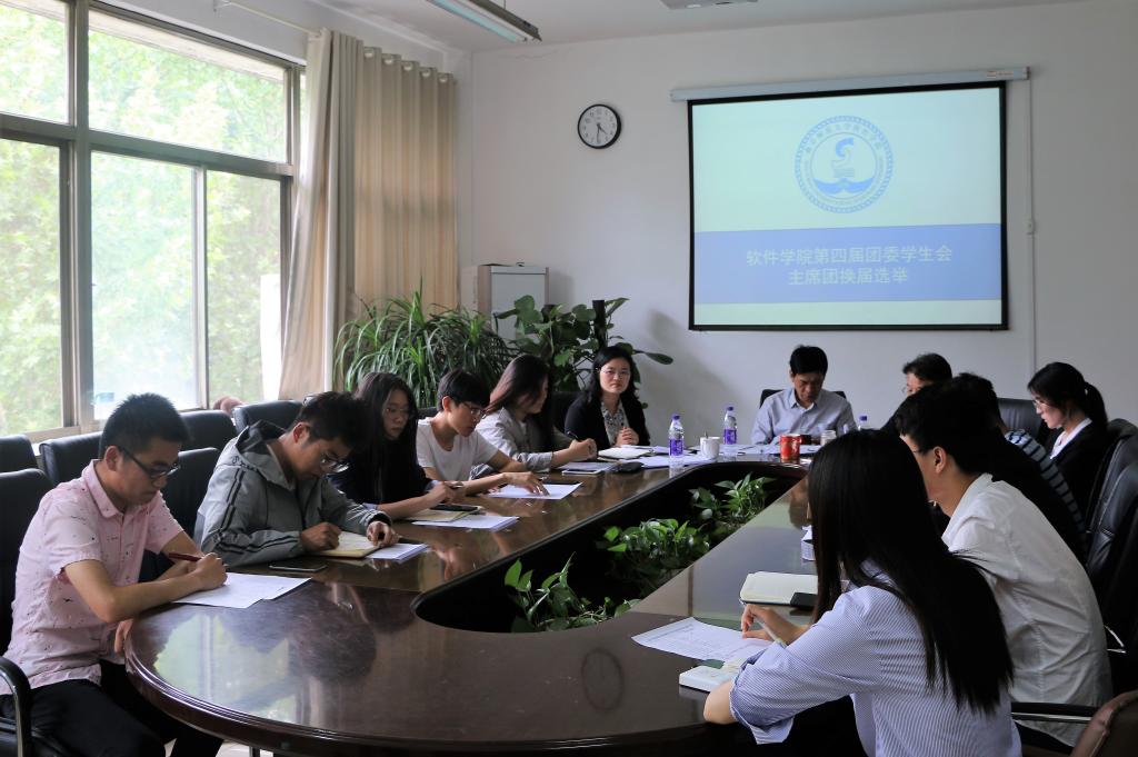 5 月11日下午三点半,软件学院第四届团委学生会主席团竞岗答辩在学院会议室成功举办。软件学院党委书记田云飞、党委副书记田凯、团委书记范瑞红、辅导员郑凤华及第三届主席团成员出席本次答辩并任评委。