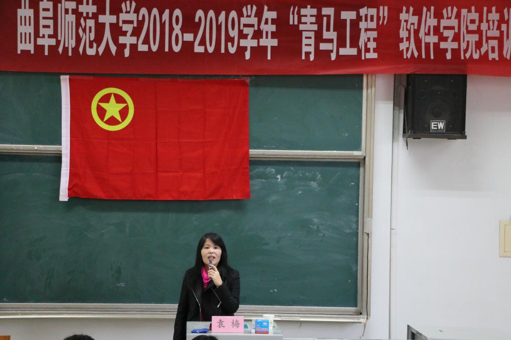 2018-2019学年“青马工程”软件学院培训班暨第二十八期团校课程第四讲在综合楼201教室成功开讲,文学院袁梅老师应邀主讲。团委书记范瑞红主持。
