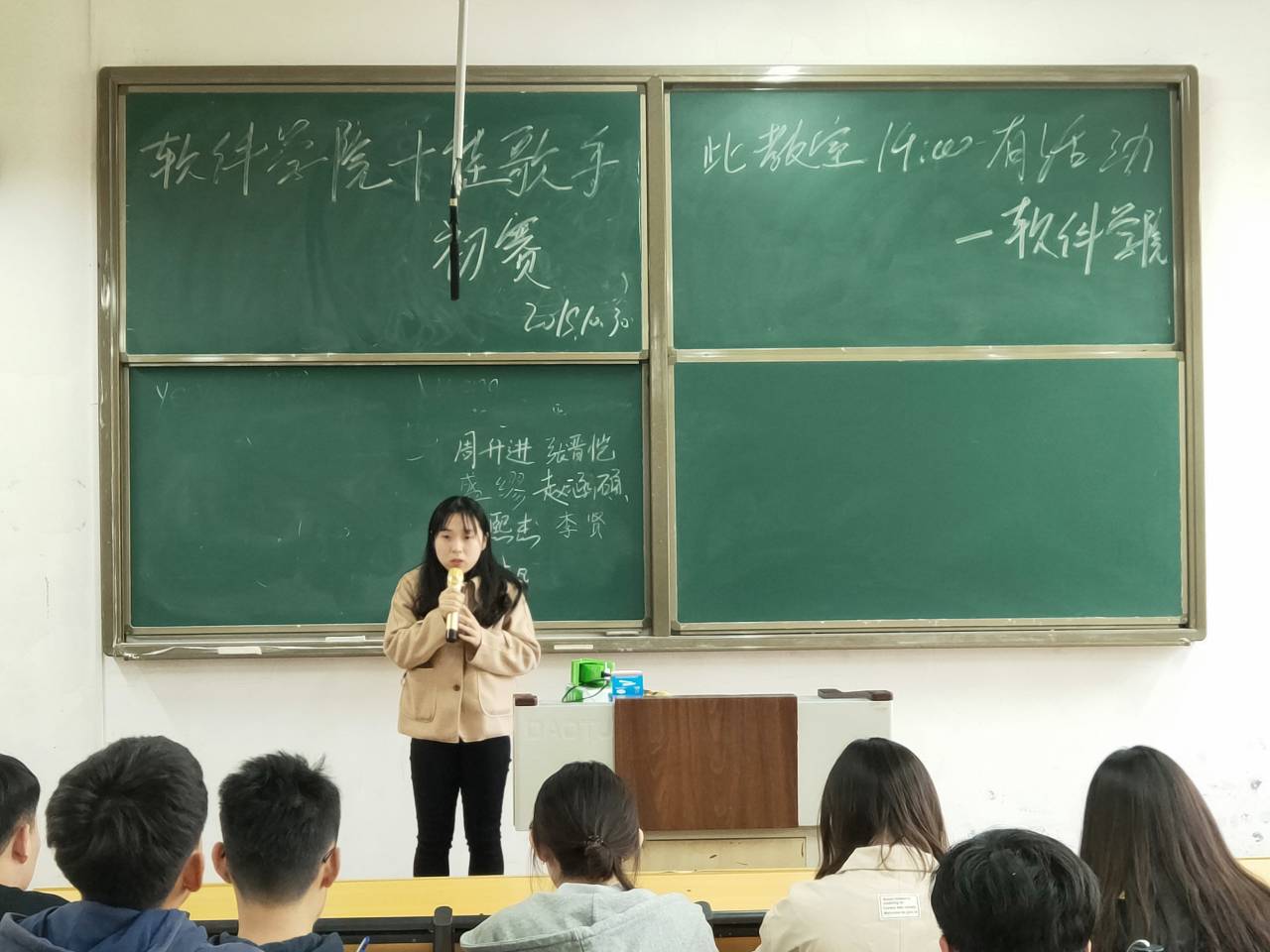 为了繁荣校园文化生活,努力营造积极向上、健康文明的校园文化气氛,为学生提供展示自己才华的舞台,软件学院“十佳歌手”大赛初赛于10月30日下午在西联四教室成功举办。软件学院文艺部部长及部分副部担任此次比赛的评委。