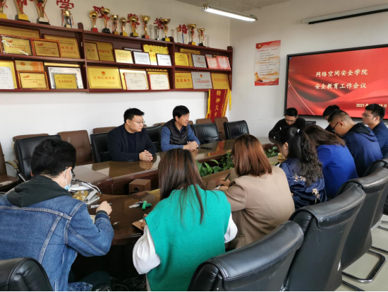 于410会议室举行安全教育工作专题会议,学院党委书记田云飞、院长王茂励、党委副书记范瑞红、副院长马旭和全体专兼职辅导员参加会议,田云飞书记主持会议。