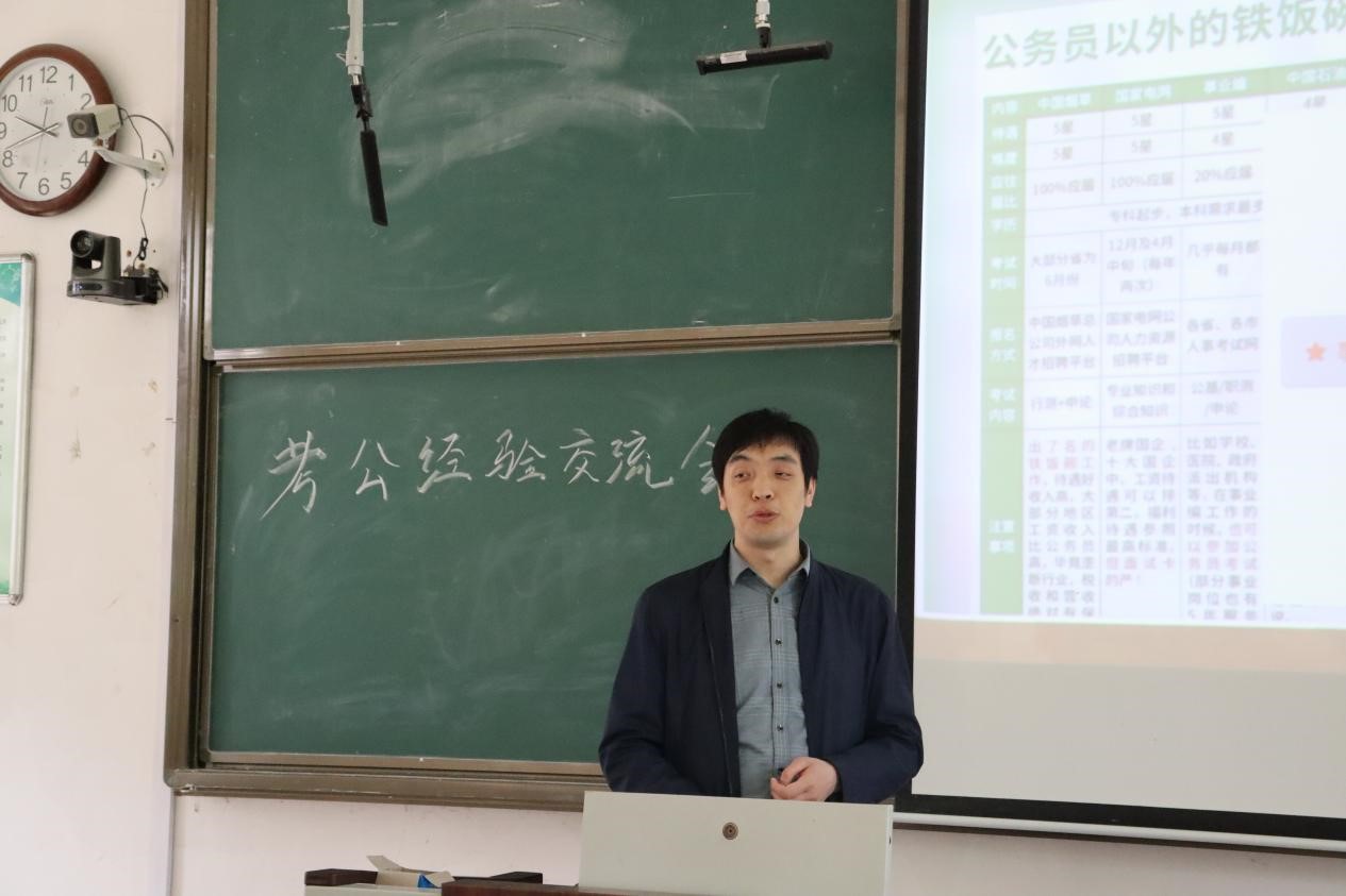 考公经验交流会于西联一举办。特邀地方政府副科级公务员颜鑫,某派出所执法办案队队长郑茂洋出席,学院教师张懿主持交流会,学院辅导员赵兴卯以及部分学生参加交流会。