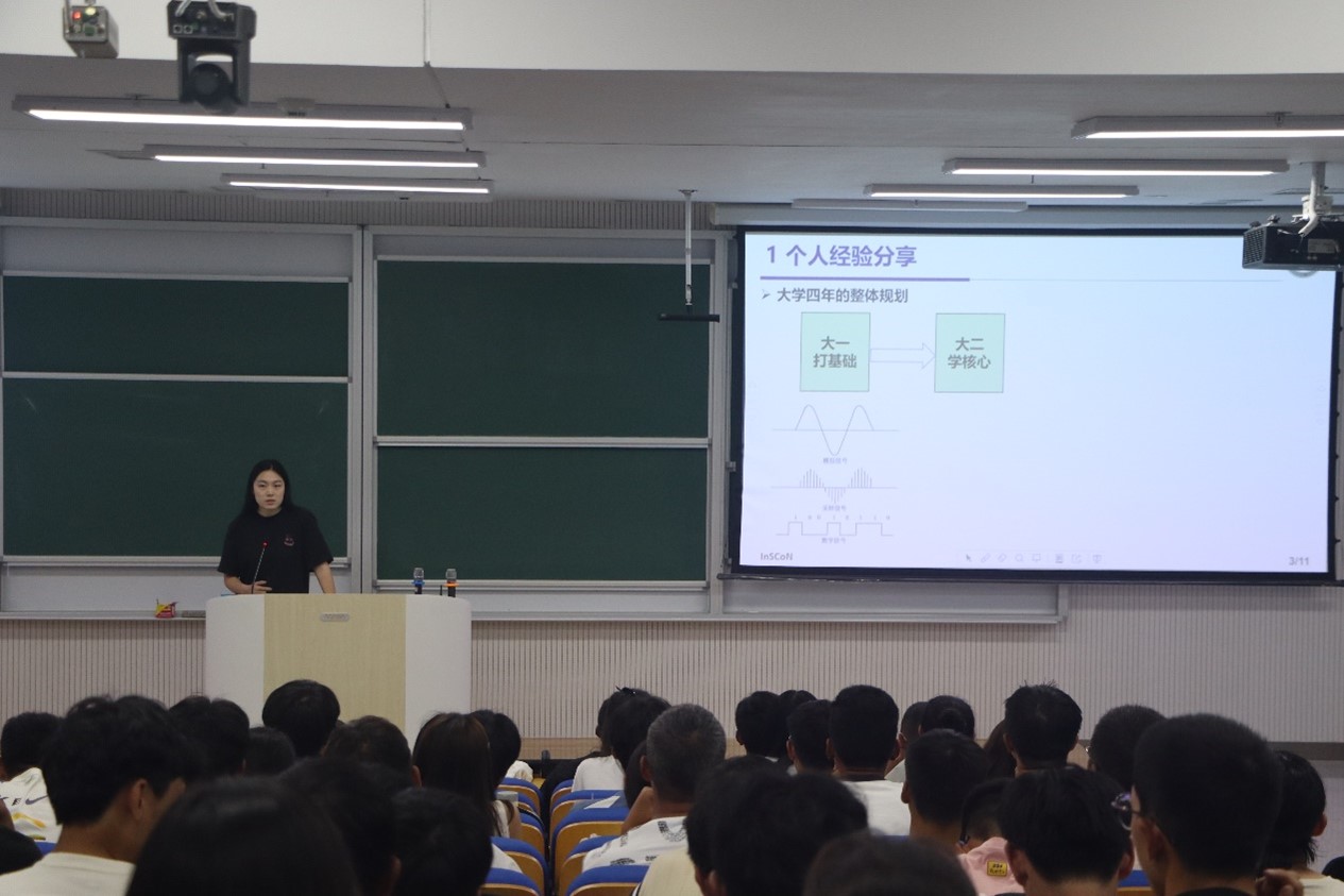 马晓聪以 “从迷茫到坚定,大学生的人生必修课”为主题与大家展开交流,她分别从个人经验、学生组织选择、大学生活建议这几方面出发,向同学们分享了自己如何规划大学四年的学习生活、如何进行合理的社交和社团活动参与。活动最后,马晓聪以“勇敢的人先享受世界”一句给予大家鼓励,勉励大家要敢于做事,勇于踏出自己的舒适圈,积极参与学生组织,锻炼自身能力,不让自己的大学生活留有遗憾。
