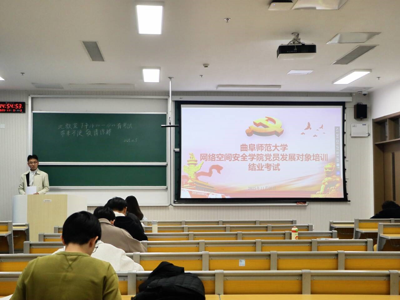 党员发展对象培训结业考试于格物楼B106教室进行,由辅导员张晗担任监考老师。