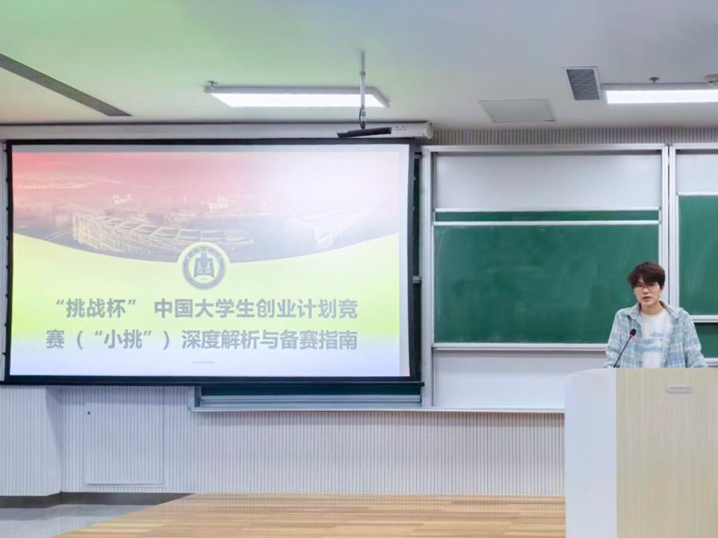 “挑战杯”宣讲会于致知楼B101、B102教室举行。本次活动由学院科创部组织,部长范广乐、申知民及副部长陈振上担任主讲,2025级全体学生参加活动。