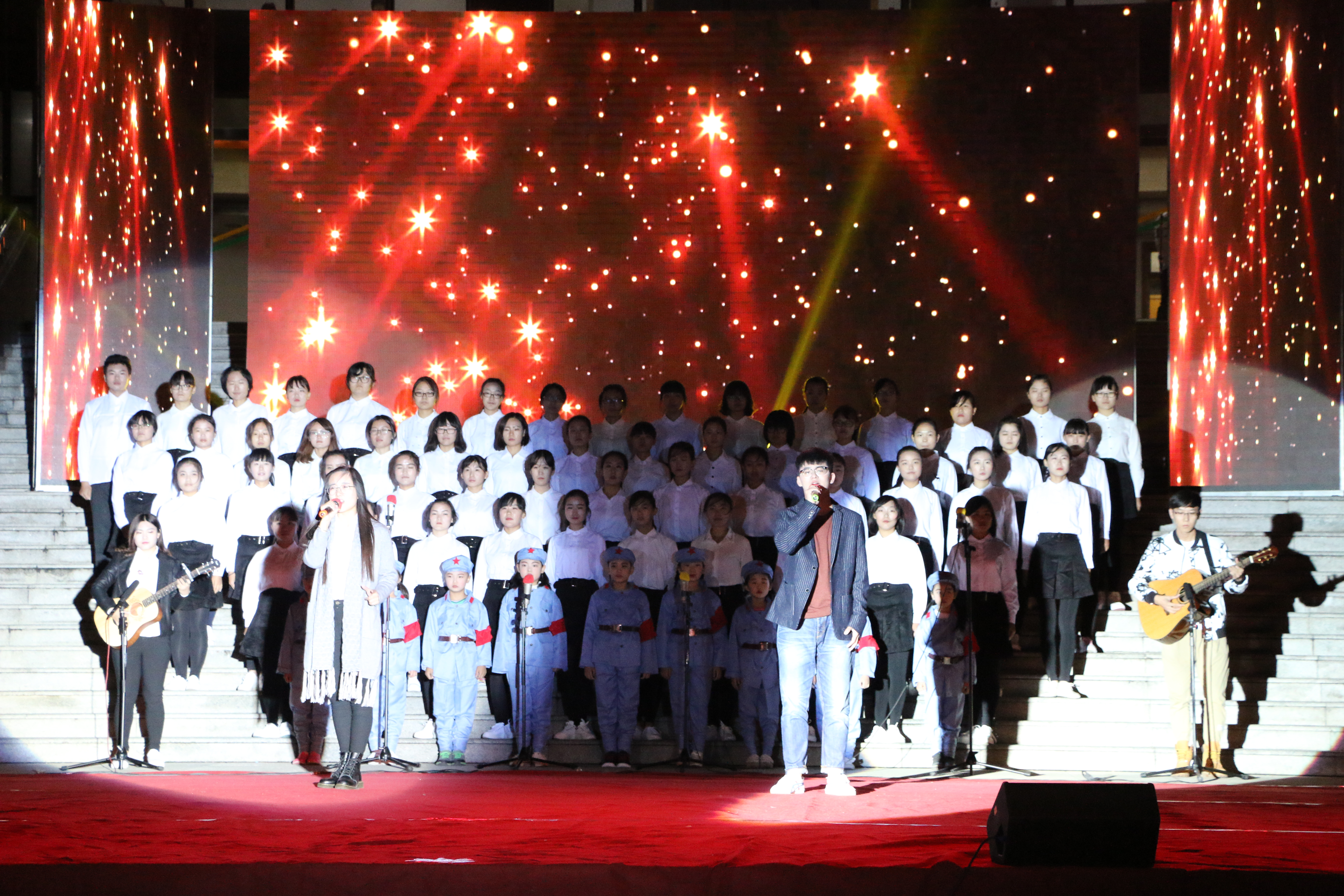 晚会以“逶迤英雄路,磅礴长征魂”为主题,共分为“踏上征程” 、“雄关漫道”、“丰碑永矗”三个篇章,软件学院与化学与化工学院的合唱《闪闪的红星》拉开了晚会的序幕,软件学子用朴实激昂的歌声歌颂了中国共产党引领华夏儿女实现民族独立、人民解放的伟大功勋;在第二篇章中,体育科学学院的舞蹈《飞夺泸定桥》,生动的表演带领大家回顾了那段可歌可泣的不朽历史;第三篇章中,音乐学院舞蹈《红色英雄》、教工合唱《江山》带给人们视听享受的同时,歌颂缅怀了先烈们视死如归、百折不挠的伟大精神。
