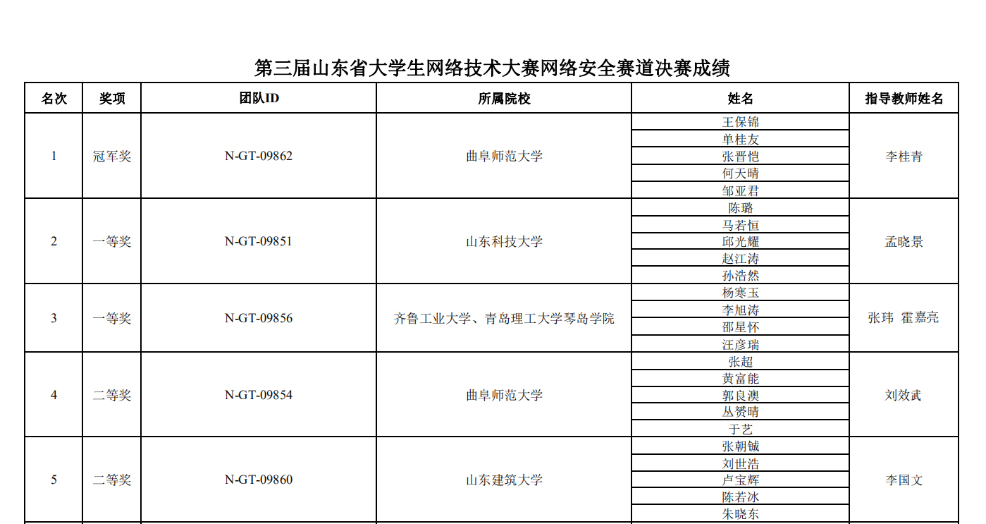 院讯(通讯员:王玉田、范瑞红)近日,第十二届山东省大学生科技节第三届山东省大学生网络技术大赛落下帷幕。王保锦、单桂友、张晋凯、何天晴、邹亚君组成的代表队,在学院李桂青老师的带领下,荣获网络安全赛道冠军奖,李桂青老师获得优秀指导老师。