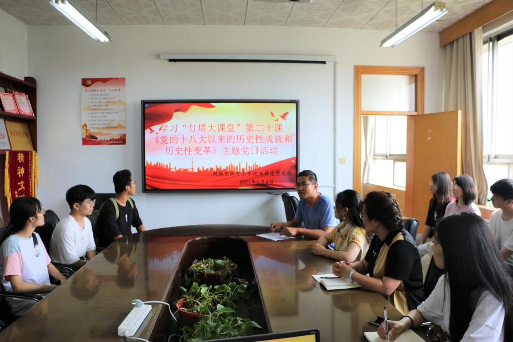 本科生党支部在学院410会议室开展了主题党日活动,学习“灯塔大课堂”第二十课《党的十八大以来的历史性和历史性变革》。本次会议由辅导员武玉龙主持,团委书记范瑞红、辅导员洪亚玲以及本科生党员参加。