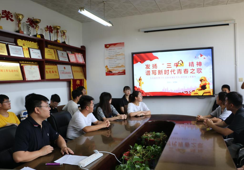 院长王茂励在学院会议室围绕“三牛”精神,为本科生党员上了一堂生动的主题党课:《发扬“三牛”精神,谱写新时代青春之歌》