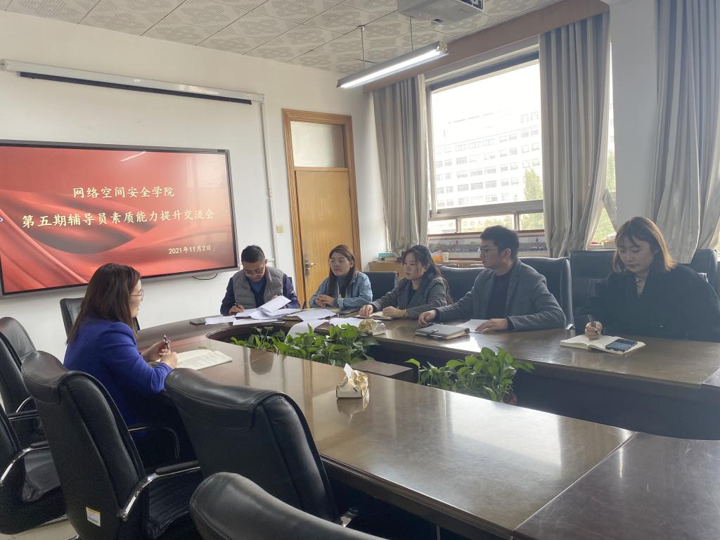 院讯(通讯员:相青)为了进一步巩固提升辅导员的职业能力和专业素养,11月2日上午,网络空间安全学院第五期辅导员素质能力提升交流会在410会议室举行,学院党委副书记范瑞红,辅导员洪亚玲、武玉龙、丁允念、相青、于媚媛参加学习交流。