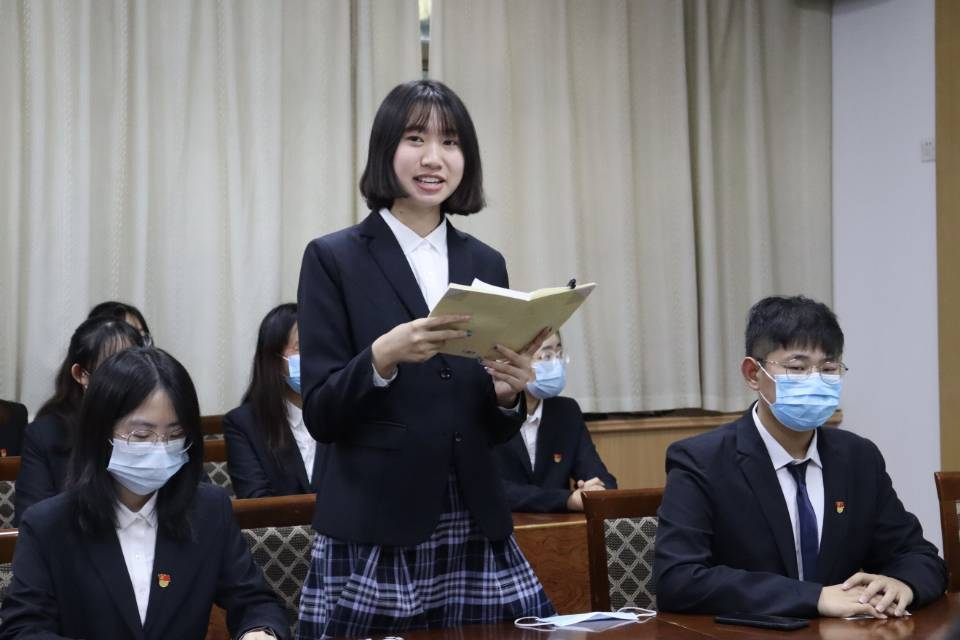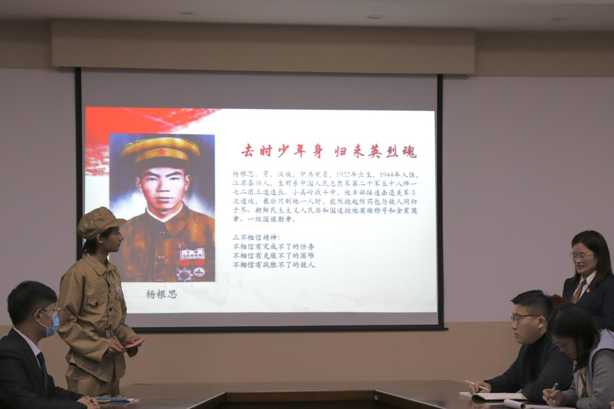 本次活动围绕伟大抗美援朝精神开展学习。活动开始,播放了《长津湖》片段,引导同学们感受抗美援朝战争的波澜壮阔和艰苦卓绝。随后通过现场演绎与英雄人物杨根思连长的对话、合唱英雄赞歌、配乐诗朗诵等环节,让同学们沉浸式深切感受抗美援朝精神的内涵,向英雄人物致以崇高的敬意。通过展示新中国几十年来的伟大成就激发学生磅礴的爱国热情,培养学生的使命担当。党员戚嘉禾谈到,感恩今天幸福生活来之不易,表示作为新时代青年要牢记历史,传承和发扬先辈们的精神,让红色精神激发力量,让红色之火熊熊不熄;党员张子扬表示,当今时代是信息时代,自己作为动漫疯