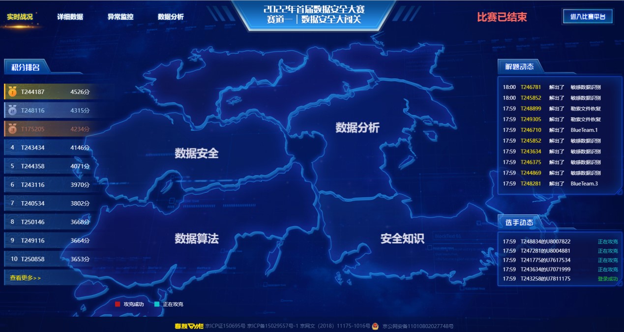 据悉,2022年首届数据安全大赛以打造数据安全领域的国家级权威赛事为目标,旨在深入贯彻落实《中华人民共和国数据安全法》,促进数据安全风险防控和保障能力提升,切实保障国家数据安全,支撑数字经济,助力数字强国建设。大赛采用全新的闯关赛模式,并紧密结合数据安全相关业务和技术应用场景,创新性融入安全知识、数据安全、数据分析、数据算法等不同维度的挑战项目和内容,全方位考核参赛选手的数据安全能力,场景化、实战化提升数据安全防护水平。晋级全国百强的队伍来自中国电信、国家电网等各行业领域单位,中兴、腾讯等专业技术公司,哈尔滨工业大学、北京邮电大学、电子科技大学、大连理工大学、华南理工大学、动漫疯