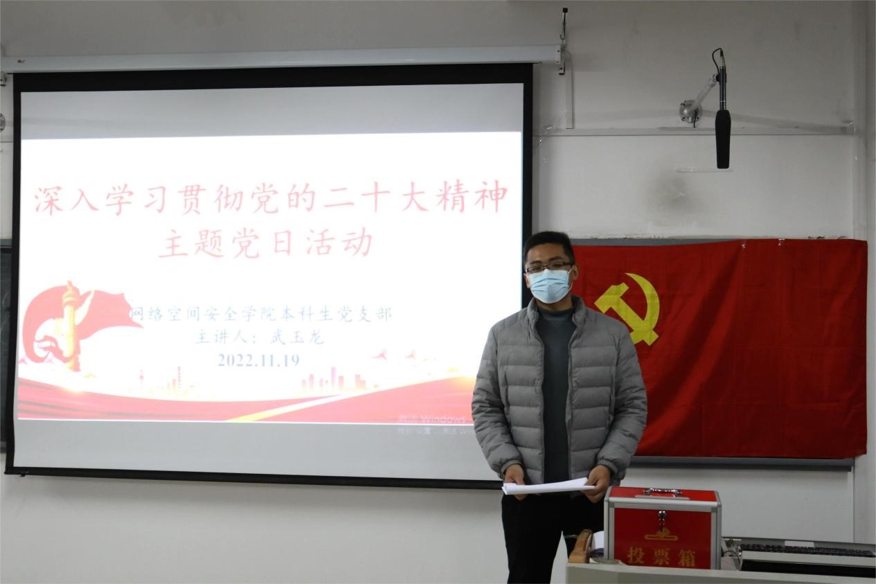 武玉龙向各位党员同志详细讲解了党的二十大的主题、过去五年的工作和新时代十年的伟大变革、开辟马克思主义中国化时代化新境界等党的二十大相关知识。武玉龙要求各位党员同志从坚持党的领导、注重实践导向、突出核心目标、遵循育人规律四个方面充分认识并深入学习党的二十大精神的重要意义。武玉龙指出,青年学生要进一步深化理论学习,加深党的科学理论的学习教育,加强实践锻炼,更要坚定不移听党话、跟党走,怀抱梦想又脚踏实地,敢想敢为又善作善成,做新时代的有为青年,努力成长为担当民族复兴大任的时代新人。