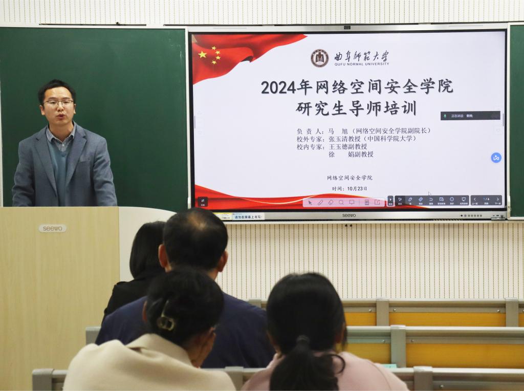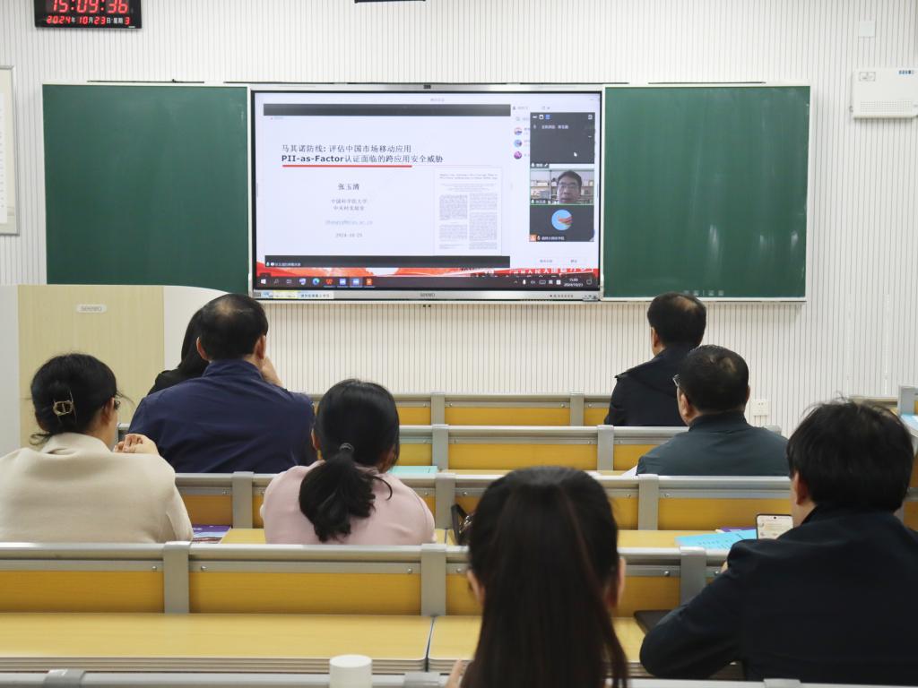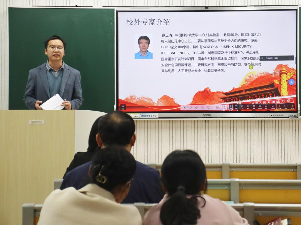 会议邀请中国科学院大学/中关村实验室 教授/博士生导师,国家计算机网络入侵防范中心主任张玉清教授作为校外专家,邀请王玉德副教授、徐娟副教授作为校内专家进行经验分享。学院研究生教学秘书曹腾担任会议主持人,全体研究生导师参加。
