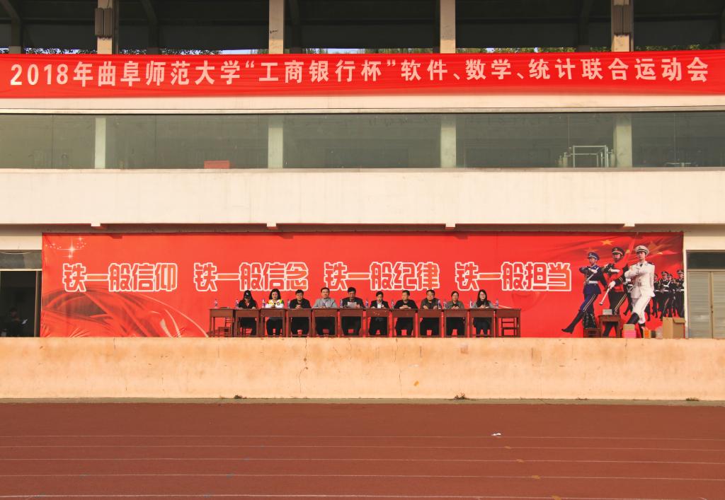 “工商银行杯”软件、数学、统计联合运动会在南操场成功举办。软件学院党委书记田云飞、数学科学学院党委书记屈跃宽、统计学院党委书记刘明海、软件学院党委副书记田凯、数学科学学院党委副书记刘建新,中国工商银行曲阜市分行行长张丽以及三个学院的团委书记、辅导员老师出席开幕仪式。